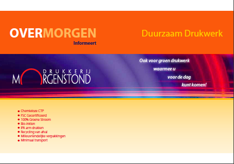 De criteria voor de productgroep Drukwerk zijn zorgvuldig, met raadpleging van verschillende belanghebbenden, samengesteld. Voor bedrijven is er een on-line tool ontwikkeld waarmee gekeken kan worden welke vereisten er gesteld worden. Zo ook voor drukwerk. De tool staat hier online Drukkerij Morgenstond heeft actief haar productieprocessen afgestemd op de vastgelegde criteria zodat wij voldoen aan de gestelde duurzaamheidscriteria. Dit is het resultaat van het doen van nieuwe investeringen in milieuvriendelijke machines, maar ook door het gebruiken van andere grondstoffen en/of levanciers.